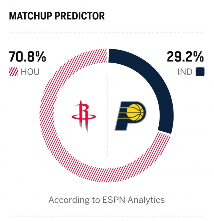 2月2日讯 明日NBA常规赛,火箭将对阵步行者。ESPN对本场比赛胜率进行了预测,火箭胜率高达70.8%,步行者则是29.2%。值得一提的是,本场火箭的杜兰特将因伤缺阵。目前火箭30胜17负西部第四,步行者13胜36负东部垫底。